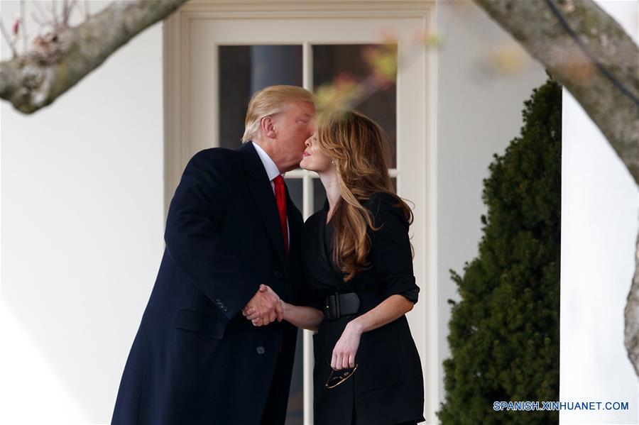 WASHINGTON D.C., marzo 29, 2018 (Xinhua) -- El presidente estadounidense Donald Trump (i) se despide de la saliente directora de Comunicaciones de la Casa Blanca, Hope Hicks (d), en la Columnata del Ala Oeste previo a su salida de la Casa Blanca, en Washington D.C., Estados Unidos, el 29 de marzo de 2018. (Xinhua/Ting Shen)