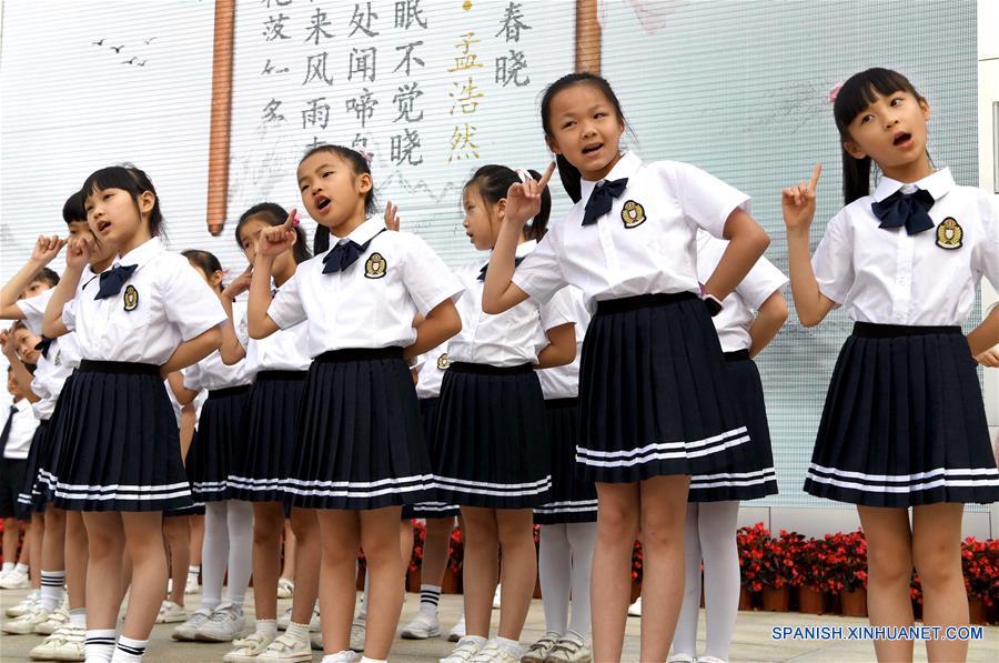 Ni?as recitan poemas en el marco del Día Internacional del Libro Infantil, en la Escuela Primaria Camino de Yulan, en la ciudad de Nanning, capital de la Región Autónoma Zhuang de Guangxi, en el sur de China, el 2 de abril de 2018. (Xinhua/Zhou Hua)