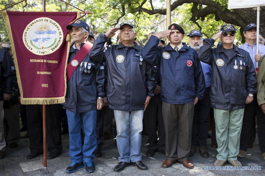 BUENOS AIRES, abril 2, 2018 (Xinhua) -- Veteranos de guerra participan en un acto por el 36 aniversario de la Guerra de las Malvinas, en la Plaza San Martín en Buenos Aires, capital de Argentina, el 2 de abril de 2018. De acuerdo con información de la prensa local, los asistentes al acto se reunieron en el Monumento a los Caídos, en donde están grabados los nombres y apellidos de 649 argentinos que murieron defendiendo a las islas de la flota británica. (Xinhua/Martín Zabala)