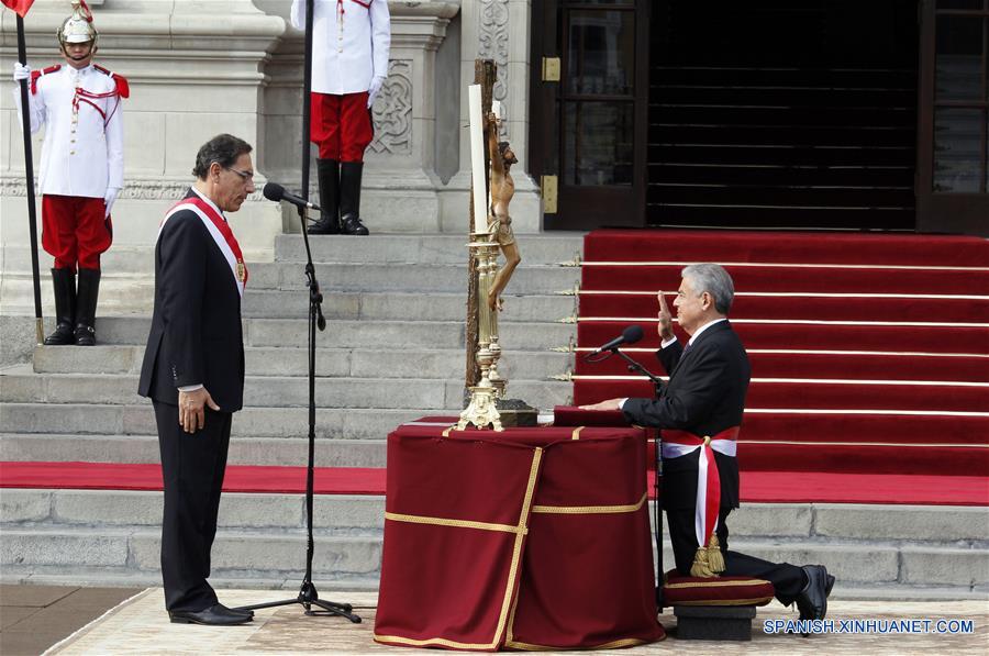 LIMA, abril 2, 2018 (Xinhua) -- El presidente peruano, Martín Alberto Vizcarra Cornejo (i-frente), toma juramento al nuevo presidente del Consejo de Ministros, César Villanueva (d), en el Patio de Honor de Palacio de Gobierno, en la ciudad de Lima, Perú, el 2 de abril de 2018. El principal partido opositor de Perú, Fuerza Popular (FP), anunció el lunes por intermedio del primer vicepresidente del Congreso, Mario Mantilla, que respaldará al nuevo equipo ministerial del presidente Martín Vizcarra. Precisó que una de sus tareas será servir de intermediario entre el Parlamento, dominado por la oposición, y el gobierno, para facilitar la gestión del equipo ministerial que acompa?ará desde este lunes a Vizcarra hasta el 2021. (Xinhua/Luis Camacho)