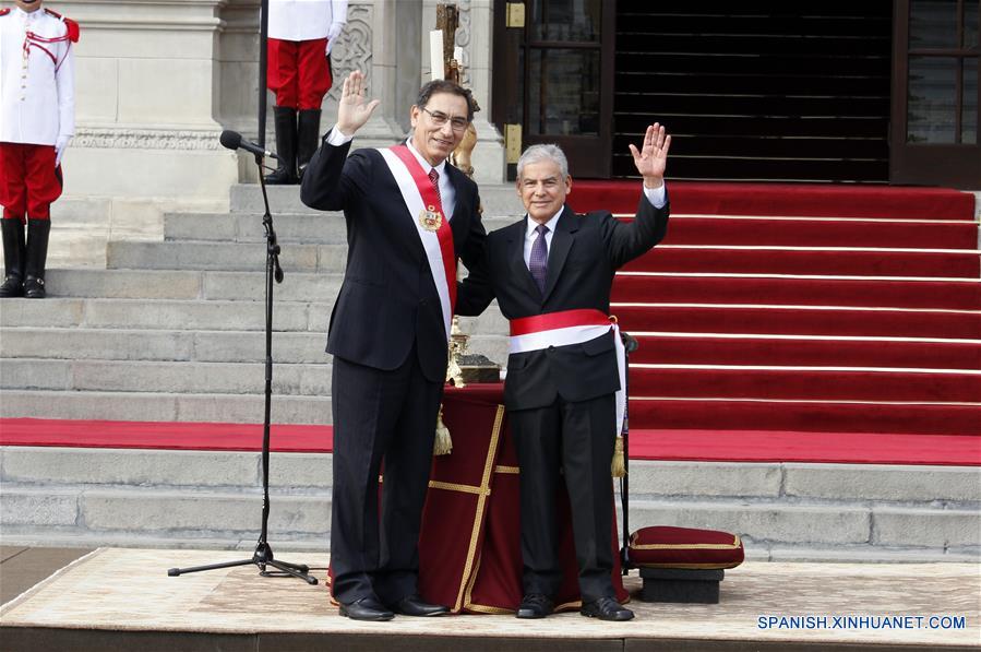 LIMA, abril 2, 2018 (Xinhua) -- El presidente peruano, Martín Alberto Vizcarra Cornejo (i-frente), y el presidente del Consejo de Ministros, Cesar Villanueva (d), posan durante la ceremonia de juramentación del primer Gabinete Ministerial, en el Patio de Honor de Palacio de Gobierno, en la ciudad de Lima, Perú, el 2 de abril de 2018. El principal partido opositor de Perú, Fuerza Popular (FP), anunció el lunes por intermedio del primer vicepresidente del Congreso, Mario Mantilla, que respaldará al nuevo equipo ministerial del presidente Martín Vizcarra. Precisó que una de sus tareas será servir de intermediario entre el Parlamento, dominado por la oposición, y el gobierno, para facilitar la gestión del equipo ministerial que acompa?ará desde este lunes a Vizcarra hasta el 2021. (Xinhua/Luis Camacho)