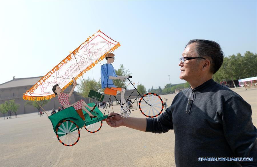 Una persona muestra un papalote hecho por él en el Parque del Patrimonio Nacional del Palacio de Daming, en Xi'an, capital de la provincia de Shaanxi, en el noroeste de China, el 3 de abril de 2018. Un festival de papalotes inició el martes en Xi'an. (Xinhua/Li Yibo)
