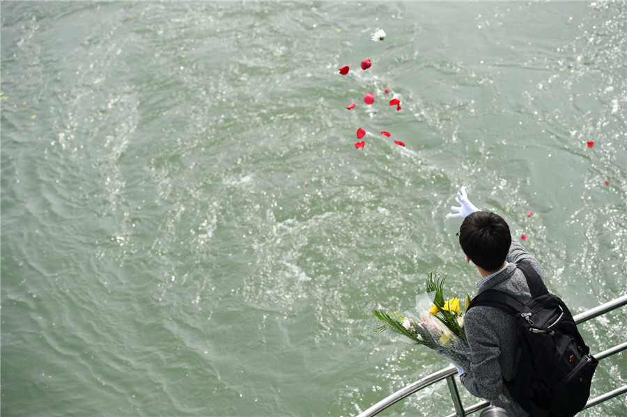 Un hombre esparce flores en el mar durante un entierro en el mar celebrado en el barco Guobin 9, el 2 de abril de 2018. [Foto / Xinhua]