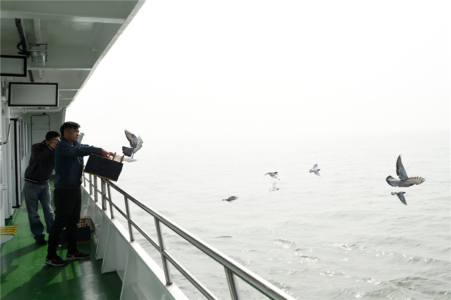 Un miembro de la tripulación libera varias palomas antes de que comience un entierro en el mar celebrado en el barco Guobin 9, el 2 de abril de 2018. [Foto / Xinhua]