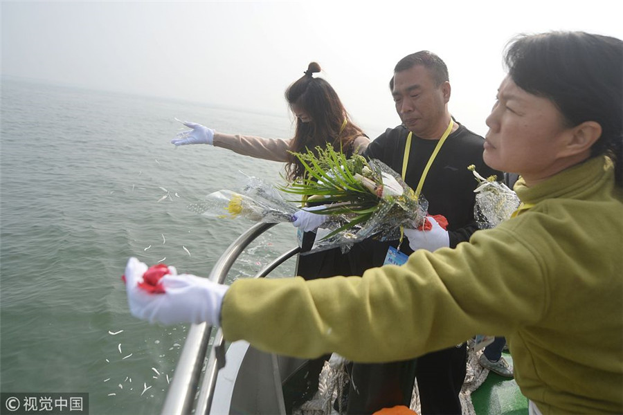 La gente lanza flores al agua durante un entierro en el mar celebrado en el barco Guobin 9, el 2 de abril de 2018. [Foto / Xinhua]