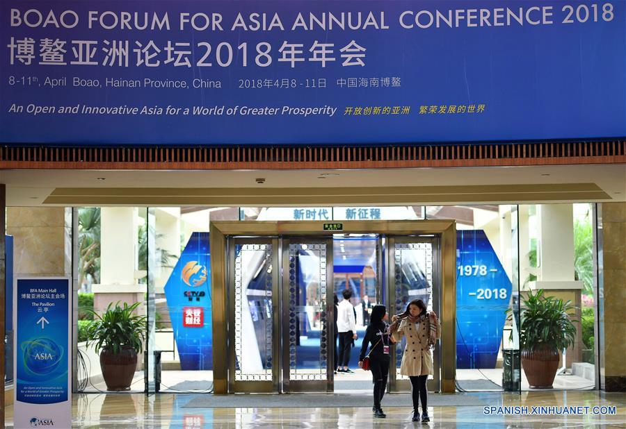 HAINAN, abril 7, 2018 (Xinhua) -- Personas permanecen en la sede principal del Foro Boao de Asia (FBA), en la localidad de Boao, en la provincia de Hainan, en el sur de China, el 7 de abril de 2018. El foro, que se celebrará del 8 al 11 de abril en Boao, una localidad costera de Hainan, tendrá como tema "Una Asia abierta e innovadora para un mundo de mayor prosperidad". (Xinhua/Guo Cheng)