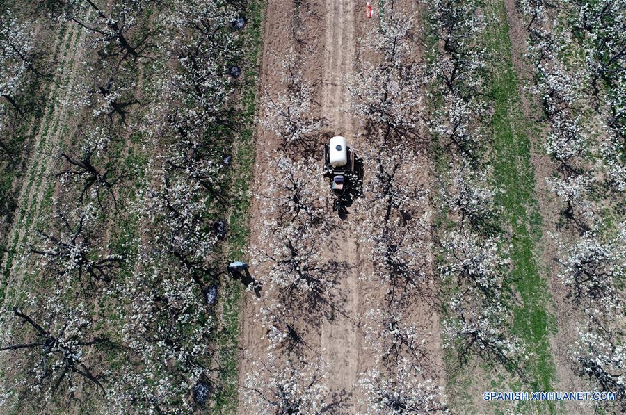 Imagen aérea de granjeros trabajando en un huerto de peras en la villa Dasang del condado de Qixian, en la provincia de Shanxi, en el norte de China, el 9 de abril de 2018. (Xinhua/Zhan Yan)