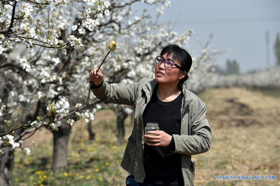 SHANXI, abril 9, 2018 (Xinhua) -- Una granjera poliniza flores de pera en un huerto de peras en la villa Dasang del condado de Qixian, en la provincia de Shanxi, en el norte de China, el 9 de abril de 2018. (Xinhua/Zhan Yan)