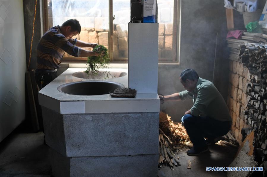 NANCHANG, abril 10, 2018 (Xinhua) -- Granjeros cocinan hojas de té en la villa Makou del distrito de Wanli, en la ciudad de Nanchang, en la provincia de Jiangxi, en el este de China, el 10 de abril de 2018. El jardín de té en esta villa, cubriendo un área de 1,000 Mu (67 hectáreas), fue transformado de una monta?a árida. Gracias a la industria del té, el ingreso anual per capita de los residentes ha incrementado en 3,000 yuanes (477 dólares estadounidenses). (Xinhua/Zhou Mi)