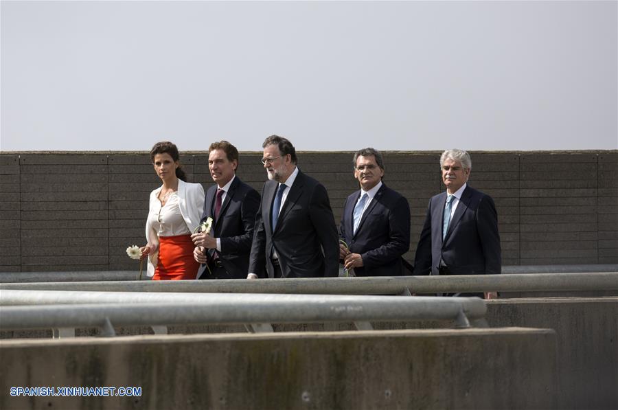 BUENOS AIRES, abril 11, 2018 (Xinhua) -- El presidente del gobierno espa?ol, Mariano Rajoy (c) reacciona junto al vicealcalde de la Ciudad de Buenos Aires, Diego Santilli (2-i) y a su esposa, Analía Maiorana (i), al secretario de Derechos Humanos de Argentina, Claudio Avruj (2-d) y al canciller espa?ol, Alfonso Dastis (d) durante la visita al Parque de la Memoria en la ciudad de Buenos Aires, capital de Argentina, el 11 de abril de 2018. (Xinhua/Martín Zabala)