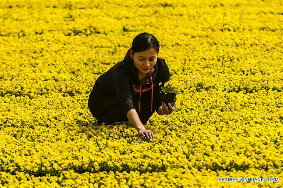 Una floricultora arregla las flores de viola en una base de flores, en la ciudad de Langfang, provincia de Hebei, en el norte de China, el 12 de abril de 2018. Los floricultores del lugar se han beneficiado enormemente de la promoción del gobierno local del funcionamiento de los negocios de flores que integra a compa?ías, floricultores y bases de plantación. (Xinhua/Li Xiaoguo)