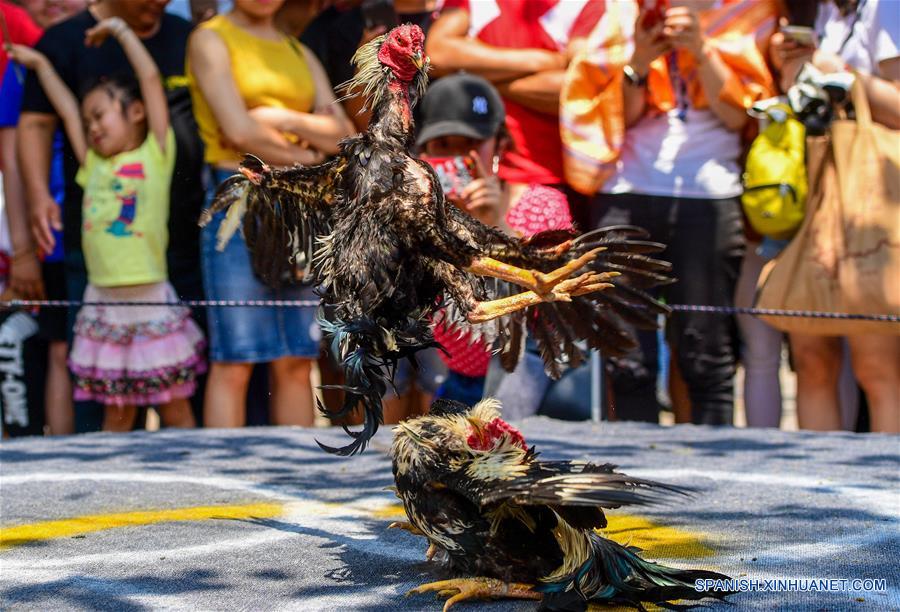 Imagen del 13 de abril de 2018 de dos gallos peleando durante un espectáculo de pelea de gallos llevado a cabo en la ciudad de Jinghong de la Prefectura Autónoma Dai de Xishuangbanna, provincia de Yunnan, en el suroeste de China. Las peleas de gallos son realizadas en Jinghong para celebrar el A?o Nuevo del grupo étnico Dai. (Xinhua/Hu Chao)