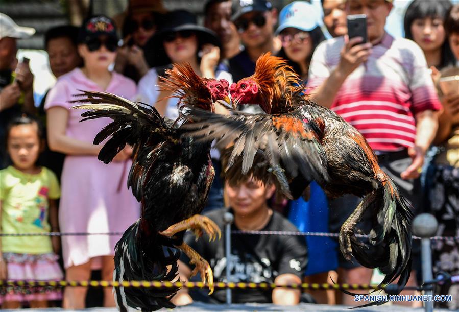 Imagen del 13 de abril de 2018 de dos gallos peleando durante un espectáculo de pelea de gallos llevado a cabo en la ciudad de Jinghong de la Prefectura Autónoma Dai de Xishuangbanna, provincia de Yunnan, en el suroeste de China. Las peleas de gallos son realizadas en Jinghong para celebrar el A?o Nuevo del grupo étnico Dai. (Xinhua/Hu Chao)