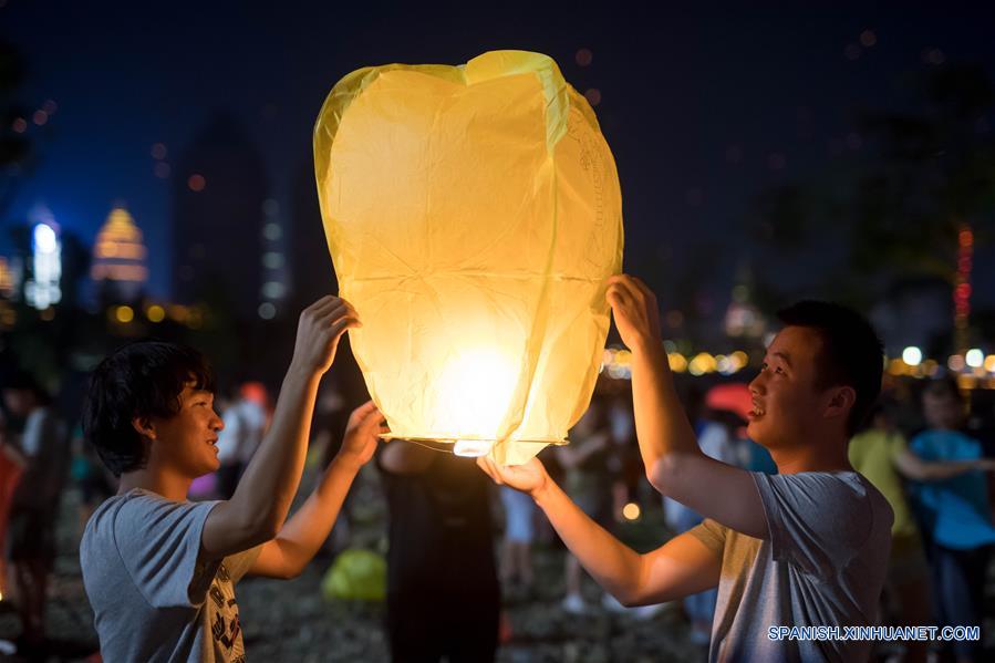 Imagen del 13 de abril de 2018 de personas volando linternas Kongming, peque?os globos de papel de aire caliente, para celebrar el A?o Nuevo del calendario del grupo étnico Dai, junto al río Lancang en la ciudad de Jinghong, provincia de Yunnan, en el suroeste de China. (Xinhua/Hu Chao)