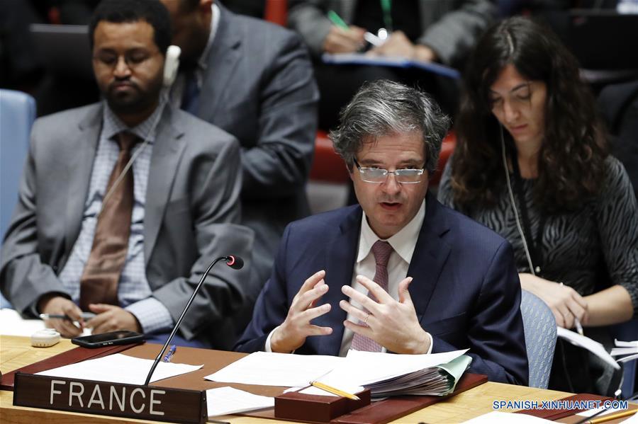 El embajadora de Francia ante la Organización de las Naciones Unidas (ONU), Francois Delattre (frente), participa en una reunión de emergencia del Consejo de Seguridad sobre Siria, en la sede de la ONU en Nueva York, Estados Unidos, el 14 de abril de 2018. El Consejo de Seguridad llevó a cabo el sábado una reunión de emergencia sobre Siria requerida por Rusia. El secretario general de la ONU, Antonio Guterres. El secretario general de la ONU, Antonio Guterres, expresó su preocupación por los ataques aéreos encabezados por EEUU contra Siria y afirmó que mantener la paz y seguridad internacional es trabajo del Consejo de Seguridad de las Naciones Unidas. (Xinhua/Li Muzi)