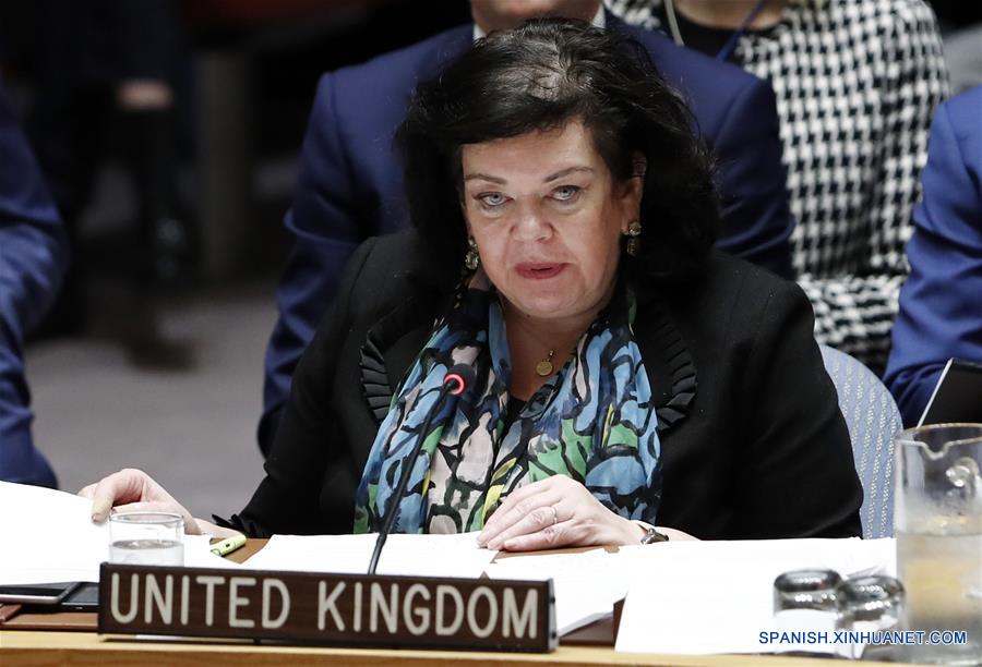 La embajadora de Reino Unido ante la Organización de las Naciones Unidas (ONU), Karen Pierce (frente), participa en una reunión de emergencia del Consejo de Seguridad sobre Siria, en la sede de la ONU en Nueva York, Estados Unidos, el 14 de abril de 2018. El Consejo de Seguridad llevó a cabo el sábado una reunión de emergencia sobre Siria requerida por Rusia. El secretario general de la ONU, Antonio Guterres, expresó su preocupación por los ataques aéreos encabezados por EEUU contra Siria y afirmó que mantener la paz y seguridad internacional es trabajo del Consejo de Seguridad de las Naciones Unidas. (Xinhua/Li Muzi)