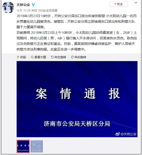 Shandong, 16/04/2018 (El Pueblo en Línea) -Una maestra de guardería en Jinan, provincia de Shandong, fue detenida el viernes tras ser sospechosa de haber abusado de un ni?o de 4 a?os que sufrió quemaduras severas en la piel por agua hirviendo, según la policía local.
