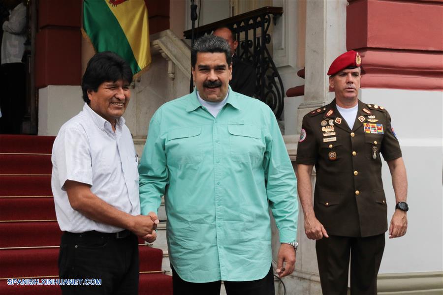 CARACAS, abril 15, 2018 (Xinhua) -- El presidente de Venezuela, Nicolás Maduro (d-frente), estrecha la mano con su homólogo boliviano, Evo Morales (i), en el Palacio de Miraflores, en Caracas, capital de Venezuela, el 15 de abril de 2018. De acuerdo con información de la prensa local, durante la reunión ambos mandatarios condenaron la guerra mediática que difunden algunos medios internacionales para justificar los ataques que realizó el viernes Estados Unidos en Siria, y destacaron la unidad entre Bolivia y Venezuela en la construcción del socialismo y un mundo equitativo. (Xinhua/Prensa Presidencial/AVN)