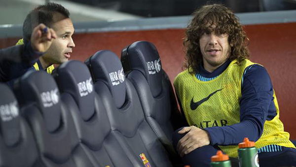 Carles Puyol y Andrés Iniesta en el banquillo duante un partido de Copa - EFE