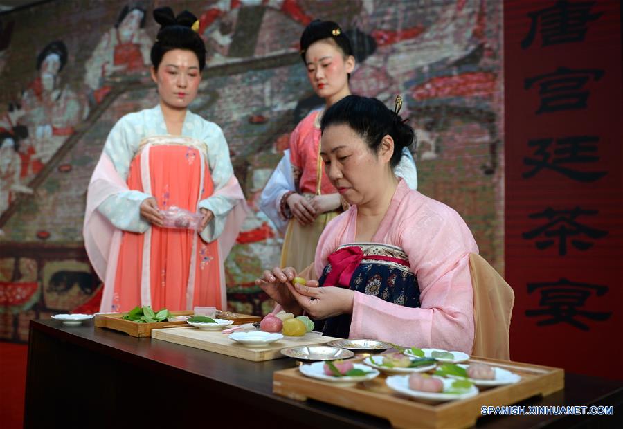 XI'AN, abril 18, 2018 (Xinhua) -- Una especialista en el arte del té vestida con ropajes de la dinastía Tang (618-907) prepara comida tradicional durante una demostración de cocina del té al estilo Tang, en Xi'an, capital de la provincia de Shaanxi, en el noroeste de China, el 18 de abril de 2018. (Xinhua/Liu Xiao)
