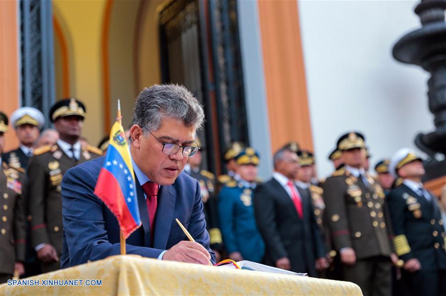 CARACAS, abril 19, 2018 (Xinhua) -- Imagen cedida por el Ministerio del Poder Popular para Relaciones Interiores, Justicia y Paz de Venezuela, del ministro venezolano de Educación, Elías Jaua (frente), participando en la ceremonia de izada de la bandera nacional venezolana para el comienzo de la conmemoración los 208 a?os del 19 de abril de 1810, fecha en la que el pueblo venezolano marcó el inicio de la lucha por la Independencia contra el imperio espa?ol, en el Panteón Nacional en Caracas, capital de Venezuela, el 19 de abril de 2018. El evento fue presidido por los ministros del Interior, Justicia y Paz, Néstor Reverol, de Defensa, Vladimir Padrino López, de Educación, Elías Jaua, así como el comandante estratégico operacional de la Fuerza Armada Nacional Bolivariana, almirante Remigio Ceballos, y otros integrantes del gabinete ejecutivo, de acuerdo con información de la prensa local. (Xinhua/Ministerio de Interior y Justicia de Venezuela)