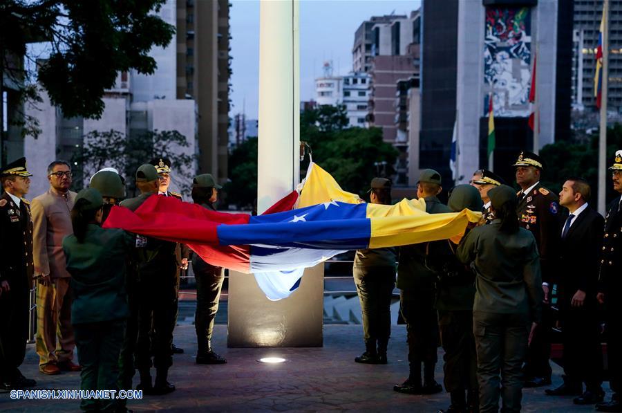 CARACAS, abril 19, 2018 (Xinhua) -- Imagen cedida por el Ministerio del Poder Popular para Relaciones Interiores, Justicia y Paz de Venezuela, de funcionarios participando en la ceremonia de izada de la bandera nacional venezolana para el comienzo de la conmemoración los 208 a?os del 19 de abril de 1810, fecha en la que el pueblo venezolano marcó el inicio de la lucha por la Independencia contra el imperio espa?ol, en el Panteón Nacional en Caracas, capital de Venezuela, el 19 de abril de 2018. El evento fue presidido por los ministros del Interior, Justicia y Paz, Néstor Reverol, de Defensa, Vladimir Padrino López, de Educación, Elías Jaua, así como el comandante estratégico operacional de la Fuerza Armada Nacional Bolivariana, almirante Remigio Ceballos, y otros integrantes del gabinete ejecutivo, de acuerdo con información de la prensa local. (Xinhua/Ministerio de Interior y Justicia de Venezuela)