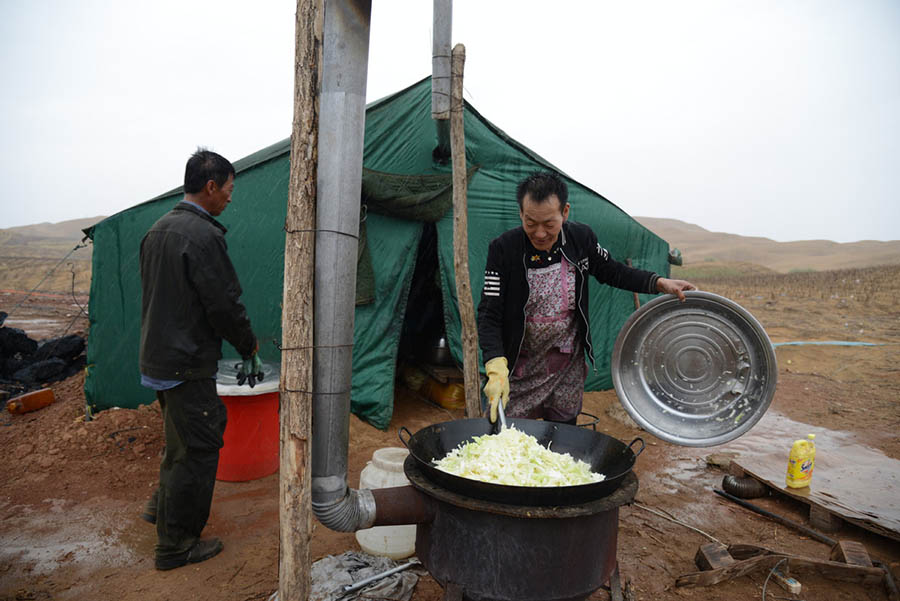Un chef prepara el almuerzo para los trabajadores fuera de una tienda de campa?a en el desierto Kubuqi en la región autónoma de Mongolia Interior, al norte de China, el 21 de abril de 2018. [Foto / Xinhua]