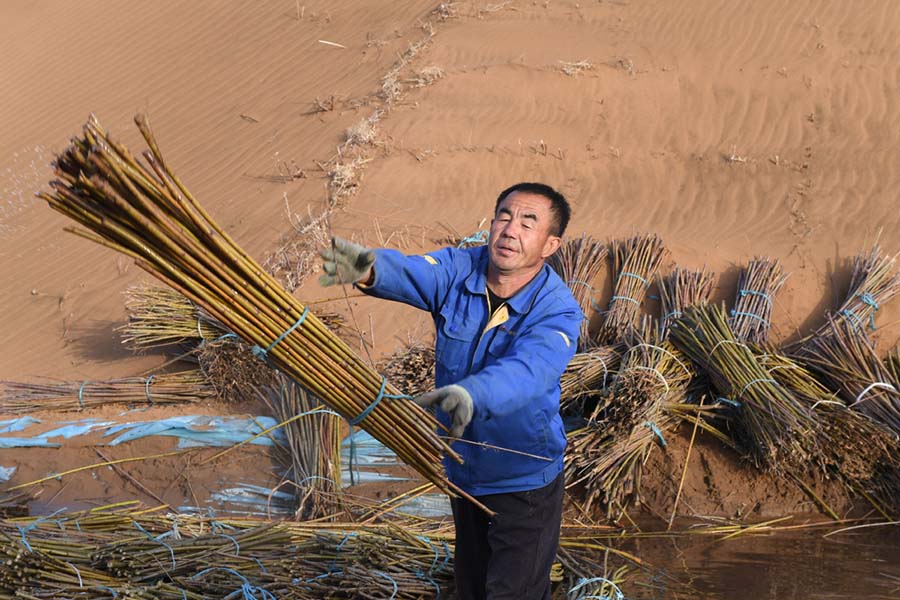 Un trabajador traslada plantones de árboles en el desierto Kubuqi en la región autónoma de Mongolia Interior, al norte de China, el 21 de abril de 2018. [Foto / Xinhua]