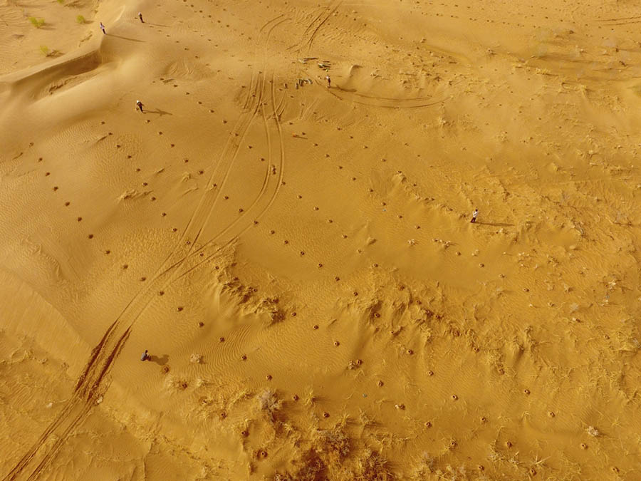 Kubuqi, Mongolia Interior, 23/04/2018 (El Pueblo en Línea) - Foto aérea del 21 de abril de 2018 muestra a los trabajadores plantando árboles en el desierto Kubuqi de la región autónoma de Mongolia Interior, en el norte de China. Miles de trabajadores se dedican al control de la desertificación del desierto Kubuqi en abril y mayo de cada a?o, periodo en el que viven en el desierto, plantan árboles y ponen obstáculos para frenar la arena. Por el momento, el 25% del desierto Kubuqi se ha librado de la desertificación. [Foto / Xinhua]