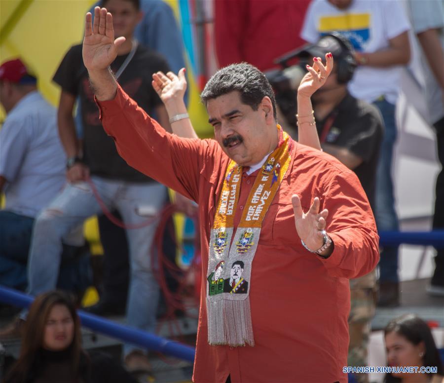 El presidente de Venezuela, Nicolás Maduro, saluda durante el evento de reinauguración del aeropuerto internacional de Tucupita Capitán de Navío "Antonio Díaz", en el estado Delta Amacuro, Venezuela, el 24 de abril de 2018. El presidente de Venezuela y candidato a la reelección, Nicolás Maduro, dijo hoy durante un acto proselitista en el estado de Delta Amacuro, que la propuesta de dolarizar la economía es anticonstitucional. "Dolarizar la economía es una propuesta anticonstitucional", subrayó Maduro en una rueda de prensa con medios nacionales e internacionales que lo recibieron en el aeropuerto de Tucupita. (Xinhua/Str)