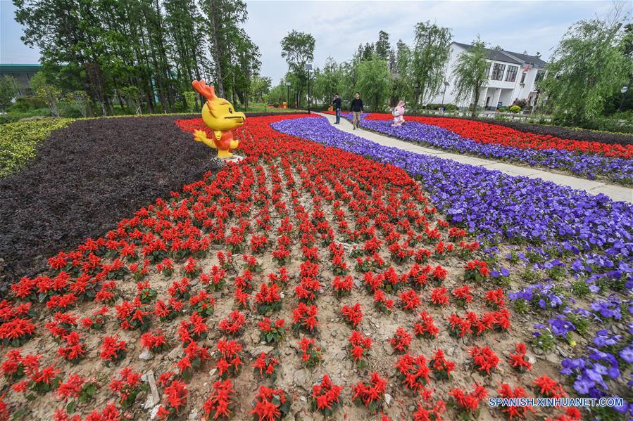 Imagen del 21 de abril de 2018 de personas caminando por un jardín de flores en la aldea Xinjinggang, en el poblado de Ganyao, en el condado de Jiashan, en la provincia de Zhejiang, en el este de China. Desde 2003, Zhengjiang ha venido implementando un proyecto para reformar el entorno de vida de sus poblados. Hasta finales del a?o pasado, un 97 por ciento de las aldeas de la provincia habían completado la revisión. (Xinhua/Xu Yu)