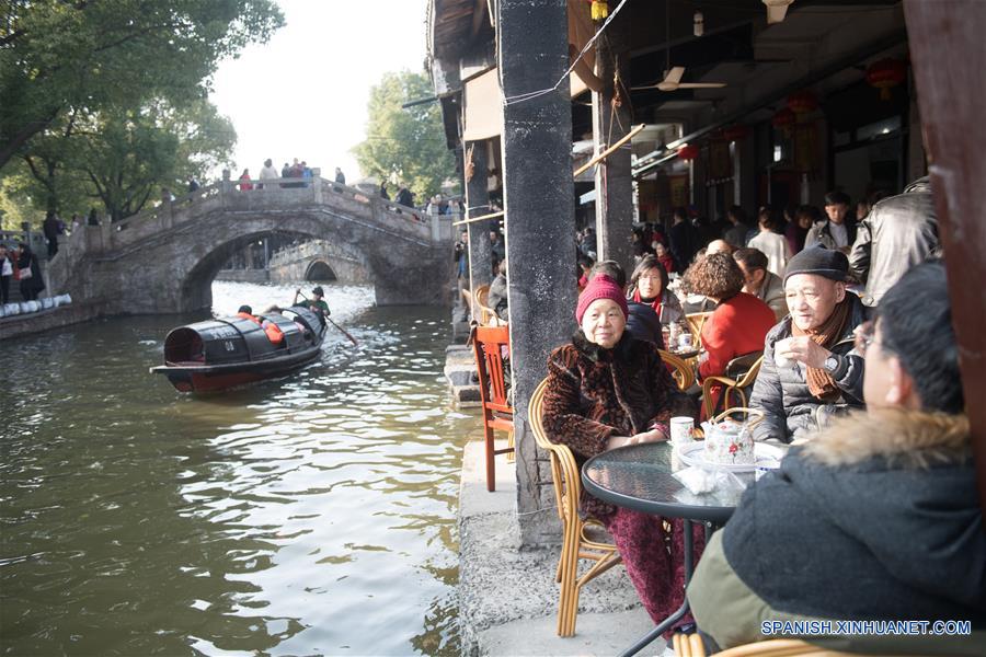 Imagen del 17 de febrero de 2018 de turistas tomando té en la ciudad antigua de Anchang, en el distrito de Keqiao, en la ciudad de Shaoxing, en la provincia de Zhejiang, en el este de China. Desde 2003, Zhengjiang ha venido implementando un proyecto para reformar el entorno de vida de sus poblados. Hasta finales del a?o pasado, un 97 por ciento de las aldeas de la provincia habían completado la revisión. (Xinhua/Weng Xinyang)