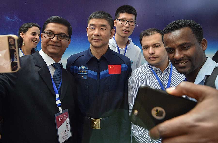 El astronauta chino Liu Boming asiste este martes a la celebración del Día del Espacio en el Instituto de Tecnología de Harbin. En 2008, Liu voló a bordo del Shenzhou VII. [Foto: Su Dong/ China Daily]