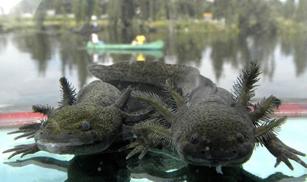 Pero la especie está en peligro de extinción debido a la contaminación de los canales, los cambios urbanos en la zona y la introducción de peces para pesca comercial como la carpa, que come huevos del ajolote, y la tilapia, que se alimenta de ajolotes juveniles.