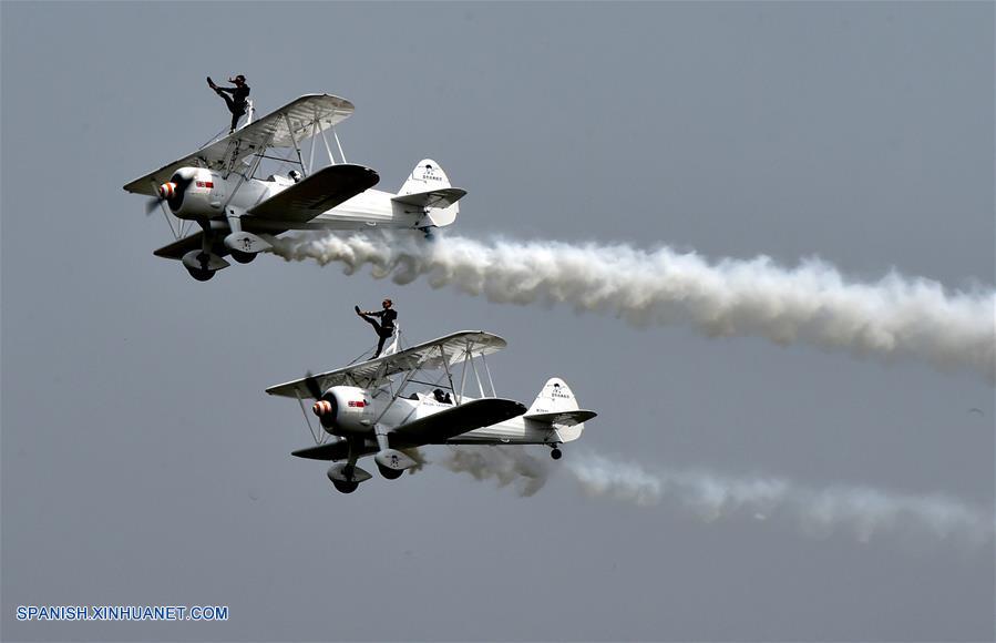 HENAN, abril 27, 2018 (Xinhua) -- Aeronaves acrobáticas vuelan durante una exhibición llevada a cabo en el Espectáculo Aéreo de Zhengzhou 2018, en Zhengzhou, capital de la provincia de Henan, en el centro de China, el 27 de abril de 2018. El Espectáculo Aéreo de Zhengzhou 2018 comenzó el viernes. (Xinhua/Feng Dapeng)