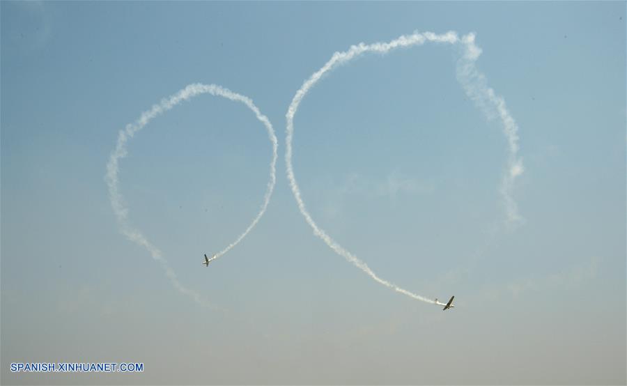 HENAN, abril 27, 2018 (Xinhua) -- Aeronaves acrobáticas vuelan durante una exhibición llevada a cabo en el Espectáculo Aéreo de Zhengzhou 2018, en Zhengzhou, capital de la provincia de Henan, en el centro de China, el 27 de abril de 2018. El Espectáculo Aéreo de Zhengzhou 2018 comenzó el viernes. (Xinhua/Feng Dapeng)