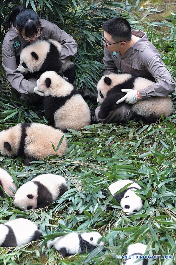 SICHUAN, abril 26, 2018 (Xinhua) -- Imagen del 13 de octubre de 2017 de cachorros de panda gigante siendo atendidos en la base Bifengxia de Ya'an del Centro para la Conservación y la Investigación del Panda Gigante de China (CCIPGCh), en la provincia de Sichuan, en el suroeste de China. Un terremoto catastrófico da?ó el 12 de mayo de 2018 la Reserva del Panda de Wolong en Sichuan. Después de un esfuerzo de diez a?os, las tres bases de Wolong, Dujiangyan y Ya'an del CCIPGCh han sido restauradas y puesto en funcionamiento. (Xinhua/Xue Yubin)