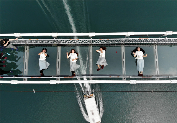 Cuatro camareras acostadas para hacerse una foto sobre un puente de vidrio en el Parque de Turismo Ecológico Shiyanhu en Changsha, provincia de Hunan, el viernes. Algunos trabajadores de base, incluyendo limpiadores de calles, chefs y guardias de seguridad, han sido invitados al museo para exhibir sus habilidades y posar para fotos creativas, antes del Festival de Mayo. YANG HUAFENG / CHINA NEWS SERVICE
