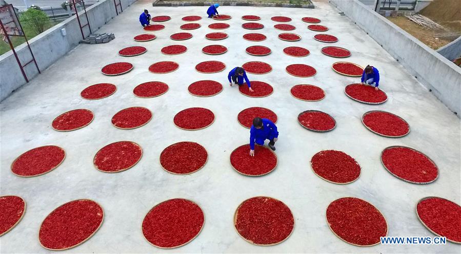 Foto aérea del 25 de abril de 2018 muestra a Zou Daying junto con empleados secando los chiles en su fábrica en la ciudad de Shangfu, condado Fengxin de la provincia de Jiangxi, el 25 de abril de 2018. Nacida en una remota aldea en la provincia de Jiangxi en 1953, Zou Daying trabajó en una comunidad antes de jubilarse en 2013. Durante ese tiempo, ella siempre compartió su salsa de chile hecha por ella misma con los vecinos, que poco a poco se hizo popular entre ellos. En 2013, Zou, de 60 a?os, comenzó su negocio para producir condimentos, incluida salsa de chile, después de retirarse de la comunidad. Debido a su sabor único y alta calidad, su producto gana reconocimiento entre más y más consumidores. Más de un millón de botellas de condimentos se vendieron en 2017. Zou empleó a los aldeanos empobrecidos como prioridad en su compa?ía y también estableció una cooperativa de cultivo de chiles para ayudarlos a salir de la pobreza. (Xinhua / Wan Xiang)