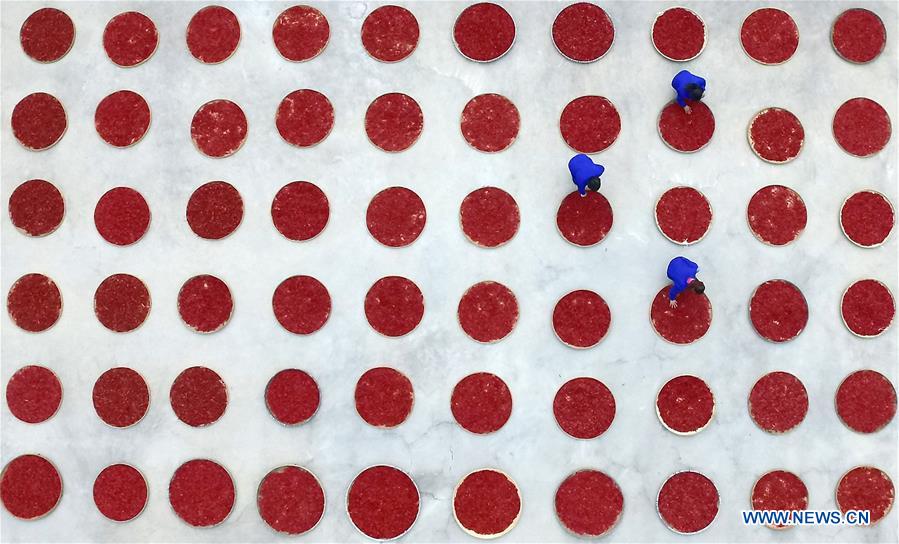 Foto aérea del 25 de abril de 2018 muestra a Zou Daying junto con empleados secando los chiles en su fábrica en la ciudad de Shangfu, condado Fengxin de la provincia de Jiangxi, el 25 de abril de 2018. Nacida en una remota aldea en la provincia de Jiangxi en 1953, Zou Daying trabajó en una comunidad antes de jubilarse en 2013. Durante ese tiempo, ella siempre compartió su salsa de chile hecha por ella misma con los vecinos, que poco a poco se hizo popular entre ellos. En 2013, Zou, de 60 a?os, comenzó su negocio para producir condimentos, incluida salsa de chile, después de retirarse de la comunidad. Debido a su sabor único y alta calidad, su producto gana reconocimiento entre más y más consumidores. Más de un millón de botellas de condimentos se vendieron en 2017. Zou empleó a los aldeanos empobrecidos como prioridad en su compa?ía y también estableció una cooperativa de cultivo de chiles para ayudarlos a salir de la pobreza. (Xinhua / Wan Xiang)