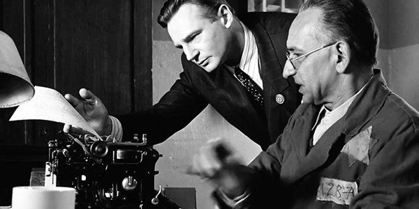 Liam Neeson (Oskar Schindler) y Ben Kingsley (Itzhak Stern), tecleando la lista,