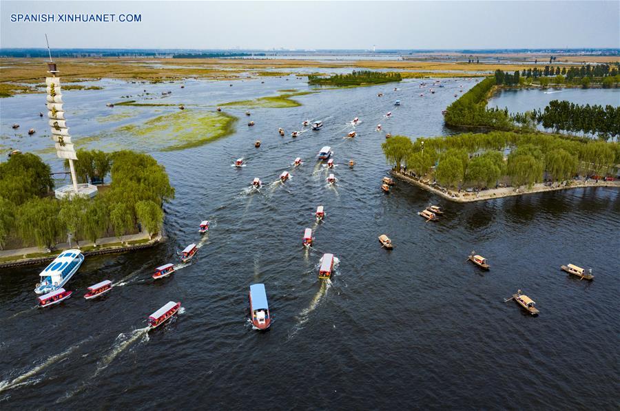 Imagen del 30 de abril de 2018 de turistas visitando el lago Baiyangdian, en la Nueva Area de Xiongan, provincia de Hebei, en el norte de China. Muchos turistas pasan su tiempo libre en la Nueva Area de Xiongan durante el día de asueto del Primero de Mayo. (Xinhua/Shen Bohan)
