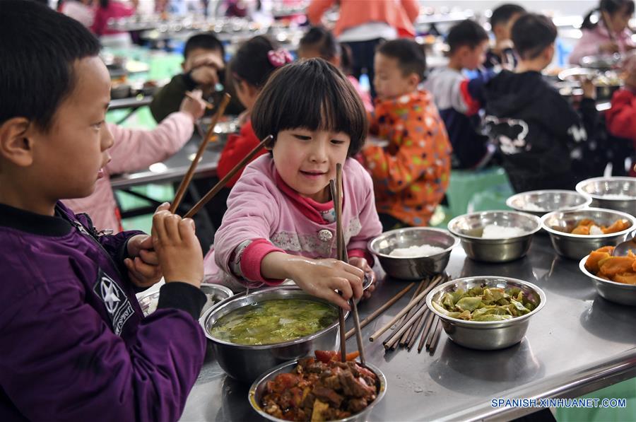 Imagen del 25 de abril de 2018 de estudiantes tomando el almuerzo en la Escuela Primaria Malu, en el condado de Qingchuan, provincia de Sichuan, en el suroeste de China. Este a?o marca el 10 aniversario del terremoto de 8.0 grados de magnitud que sacudió la provincia de Sichuan, en el suroeste de China, el 12 de mayo de 2008. Solo cuatro días después del terremoto, Xu Guang y sus 100 compa?eros de clase de la Escuela Primaria Malu sostuvieron parcartas voluntariamente para mostrar gratitud a quienes daban la mano en la reconstrucción de su escuela, que quedó en ruinas durante el terremoto. El movimiento de los ni?os causó sensación en aquel a?o. En el transcurso de 10 a?os, la ayuda a la escuela nunca se detuvo. Los apoyos a nivel nacional han permitido la construcción de un campus moderno totalmente equipado con 536 estudiantes. (Xinhua/Tao Ming)