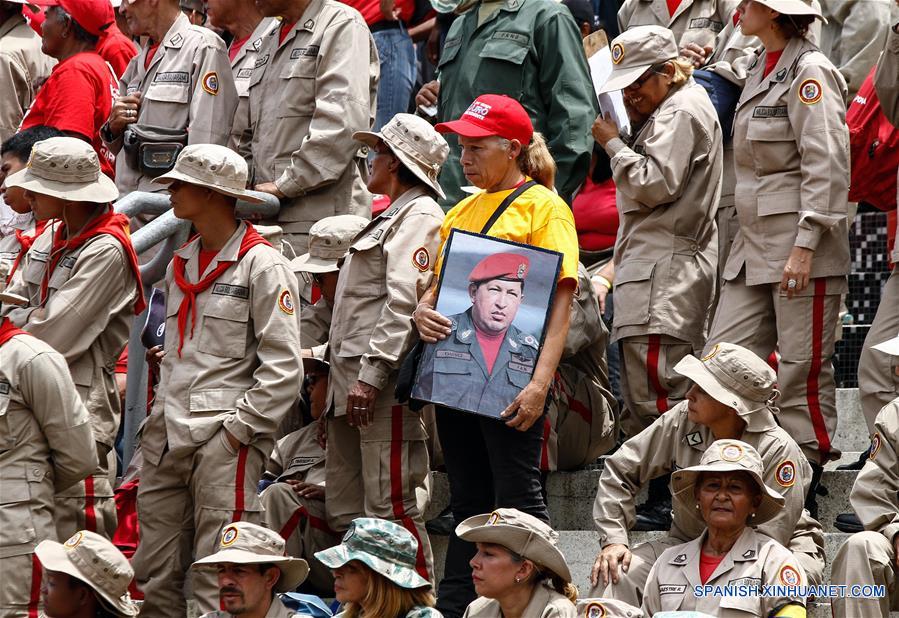 Una persona sostiene una imagen del fallecido presidente venezolano, Hugo Chávez, durante una marcha para conmemorar el Día del Trabajo y en respaldo al presidente venezolano, Nicolás Maduro, en Caracas, Venezuela, el 1 de mayo de 2018. (Xinhua/Andrea Romero)