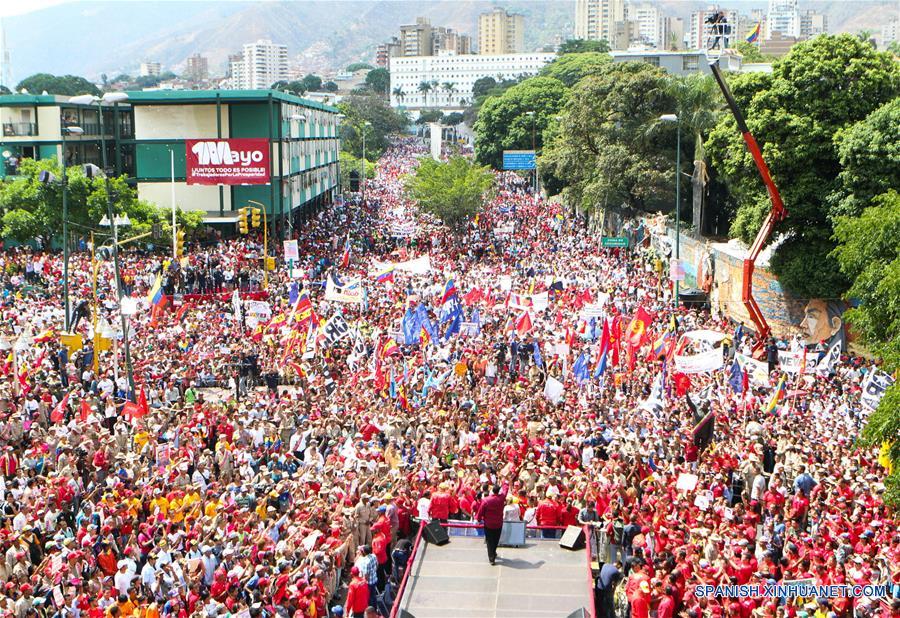 El presidente venezolano, Nicolás Maduro (c-abajo), reciba una marcha de trabajadores y miembros de distintas organizaciones sociales del país para conmemorar el Día del Trabajo y en su respaldo, en el Parque Ezequiel Zamora, en Caracas, Venezuela, el 1 de mayo de 2018. (Xinhua/Prensa Miraflores/AVN)