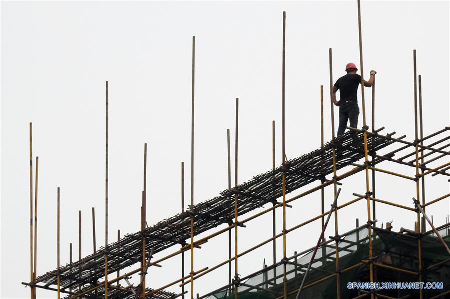 JIANGSU, mayo 1, 2018 (Xinhua) -- Un trabajador arma andamios en una obra en construcción, en la ciudad de Lianyungang, provincia de Jiangsu, en el este de China, el 1 de mayo de 2018. (Xinhua/Geng Yuhe)