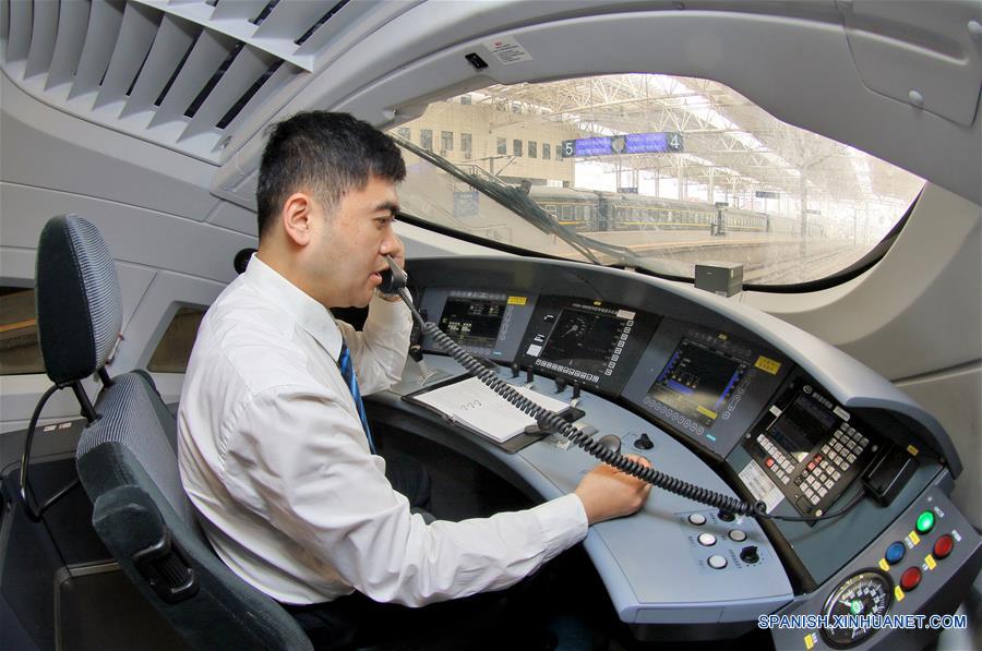 SHANDONG, mayo 1, 2018 (Xinhua) -- Un conductor se prepara previo a operar un tren en la Estación del Ferrocarril de Yantai, en Yantai, provincia de Shandong, en el este de China, el 1 de mayo de 2018. (Xinhua/Tang Ke)