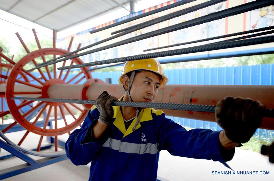 SHAANXI, mayo 1, 2018 (Xinhua) -- Un trabajador une vigas de acero en un sitio de construcción de un proyecto ferroviario, en Xi'an, provincia de Shaanxi, en el noroeste de China, el 1 de mayo de 2018. Muchos trabajadores permanecieron en sus puestos en el Día Internacional del Trabajo 2018 mientras el país goza de tres días de vacaciones. (Xinhua/Liu Xiao)