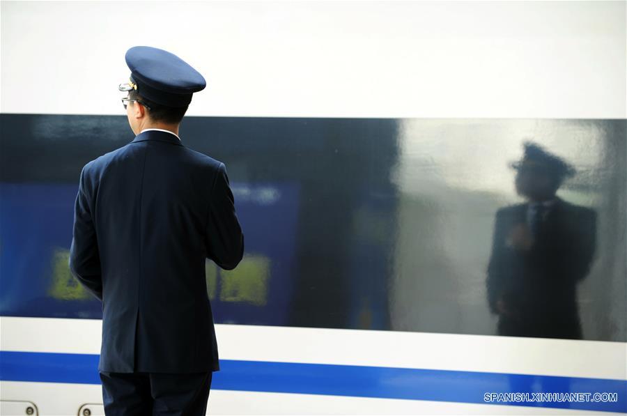 GUIZHOU, mayo 1, 2018 (Xinhua) -- Un empleado de plataforma trabaja en la Estación del Ferrocarril de Guiyang en Guiyang, provincia de Guizhou, en el suroeste de China, el 1 de mayo de 2018. Muchos trabajadores permanecieron en sus puestos en el Día Internacional del Trabajo 2018 mientras el país goza de tres días de vacaciones. (Xinhua/Yang Wenbin)