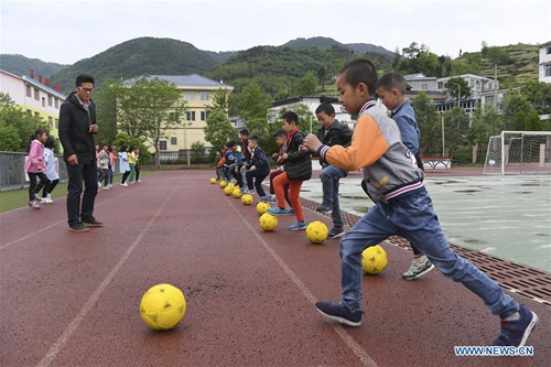 Qingchuan, Sichuan, 03/05/2018 (El Pueblo en Línea) - Los estudiantes asisten a una clase de educación física en la escuela primaria Malu en el distrito Qingchuan, provincia de Sichuan, 25 de abril de 2018. Este a?o se conmemora el décimo aniversario del terremoto de 8,0 grados de magnitud que sacudió la provincia suroccidental china de Sichuan el 12 de mayo de 2008. Sólo cuatro días después del terremoto, Xu Guang y sus 100 compa?eros de clase de la Escuela Primaria Malu exhibieron pancartas voluntariamente para mostrar su gratitud a aquellos que colaboraron en la reconstrucción de su escuela, que se derrumbó durante el terremoto. Ese acto de los ni?os causó sensación ese a?o. Después de 10 a?os, la ayuda a la escuela nunca se ha detenido. Los apoyos nacionales han servido para convertir la escuela en un campus moderno totalmente equipado con 536 estudiantes. (Xinhua / Tao Ming)